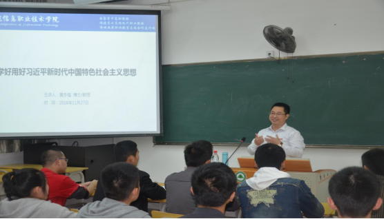 12月6日下午14:30,福建信息职业技术学院马克思主义学院院长、省教育厅“党的十九大精神和习近平新时代中国特色社会主义思想宣讲团”成员黄东福教授莅临我校,在江南校区实训四307开设“学好用好习近平新时代中国特色社会主义思想”专题讲座。学院思政部全体教师,2018年第二学期“习近平新时代中国特色社会主义思想读书社”70余名同学,以及自动化工程系第二党支部第43、44期入党积极分子共同参加。此次活动由思政部主任洪福兴主持。