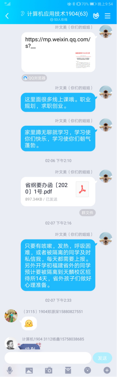 一是坚持全覆盖联系学生,关心关爱学生健康。及时按照省教育厅和学院疫情防控工作要求和部署做好疫情防控工作,全体专兼职辅导员认真、准确做好各班级防控服务,明确责任、狠抓落实,加强联动、主动协同,一对一、每日一报全体学生健康状况,做到“硬核”担当、共克时艰,全力确保疫情防控措施落实到位。