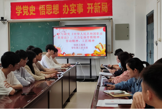 为深入贯彻学习新修订的《中华人民共和国职业教育法》,调动支部学生党员、入党积极分子参与技能大赛的积极性,大力弘扬劳模精神、劳动精神、工匠精神,信息工程系学生第三党支部于5月23日在实训三408教室召开学习研讨交流会。本次学习会由信息工程系学生第三党支部书记刘克芹老师主持,支部师生党员、入党积极分子参加这次学习会。