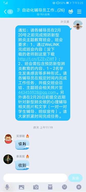 二是搭建宣传工作载体,做好思想引领。自动化工程系党总支创新工作方法,利用学生喜闻乐见的多种形式开展防控宣传工作,切实做好新型冠状病毒感染的肺炎疫情防控工作。利用QQ、网站、微信公众号等新媒体,制作发布基础防疫知识和系列“抗击疫情”比赛,报道自动化工程系“三支一扶”毕业生余伟毅等奋战在前方的战“疫”故事,让防疫科普工作贴近学生生活;依托辅导员队伍在学习强国、welink软件、优慕课等平台,召开线上防疫主题教育班会,通过多形式强调了预防病毒的重要性,同学们积极配合,热情发言,献计献策。