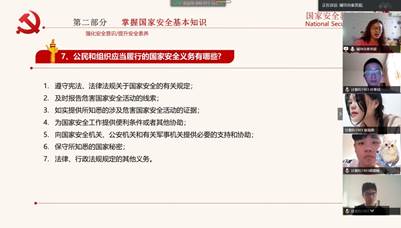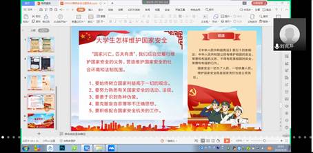 各班级积极开展线上国家安全日主题班会,主要从国家安全教育日设立的概况、掌握国家安全基本知识、真实案例学习、相关法律法规摘录、疫情防控等方面进行讲述,通过主题班会,以国家安全观为指导,紧密结合疫情防控任务,进一步帮助学生理解国家安全教育日的含义,有利于提高学生维护国家安全的法律意识和疫情防控意识,引导学生将总体国家安全观贯穿抗疫全过程。
