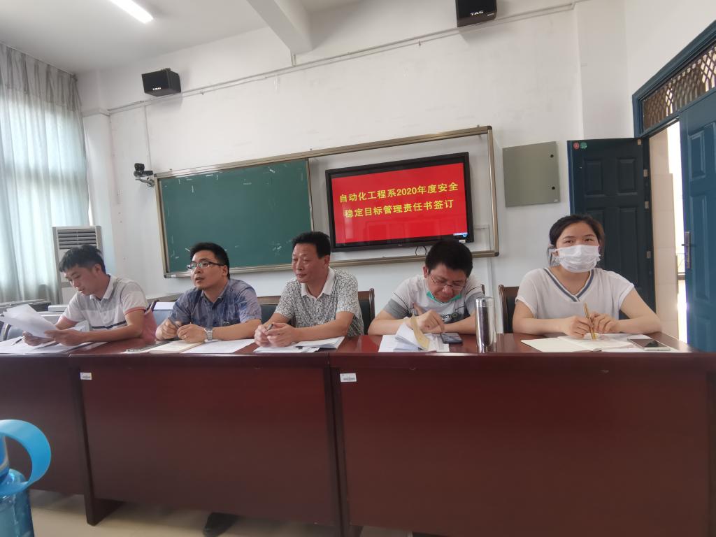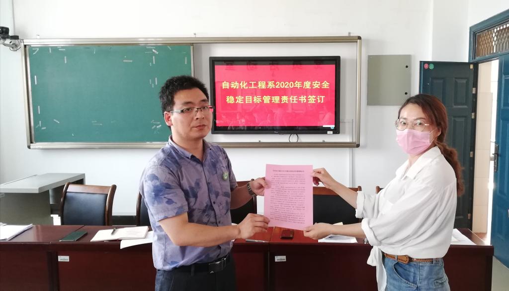 随后,全系教职工签订了《自动化工程系2020年度师德师风建设目标责任书》,各教研室主任、辅导员签订了《自动化工程系2020年度安全稳定目标管理责任书》。吴书记和华主任强调各位教师签订责任书,就要履职尽责,强化自身工作作风建设,严格落实各项有关规定,把工作落到实处,为系部的发展做出贡献。