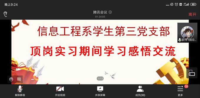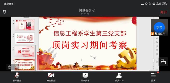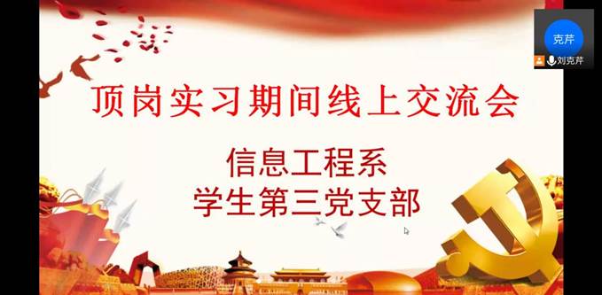 为深入学习习近平新时代中国特色社会主义思想,确保学生党员、入党积极分子顶岗实习期间培养教育不间断,10月31日晚,信息工程系学生第三党支部开展“顶岗实习期间线上交流会”主题党日活动,此次活动由学生第三党支部书记刘克芹老师主持召开,第三党支部2018级顶岗实习期间的学生党员、入党积极分子参加线上交流活动。