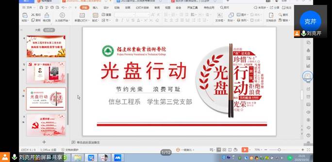 活动的第二个环节,进行党员线上学习教育,刘克芹老师带领大家进一步了解《习近平谈治国理政》第三卷和《习近平在福州》中的一些重要论述,并强调全体支部党员要充分利用“学习强国”平台加强学习,按要求完成日均学习任务;继续学习习近平总书记关于粮食安全的重要论述,提倡党员要牢固树立“节约光荣浪费可耻”的意识;强调网络意识形态问题的重要性,引导师生共同营造风清气正的良好网络舆论生态环境。