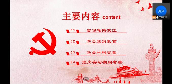本次学习交流活动主要围绕每位同学在顶岗期间所学所悟展开,切实了解支部每位学生党员与入党积极分子在实习期间的心得体会与政治学习的情况,并开展线上党员学习教育。