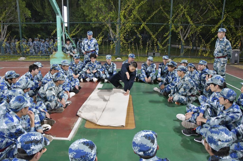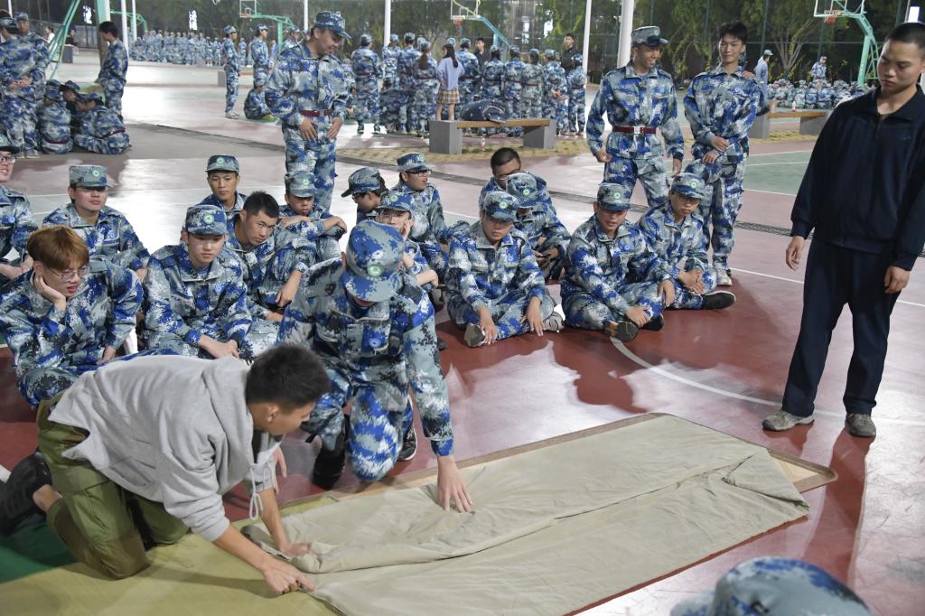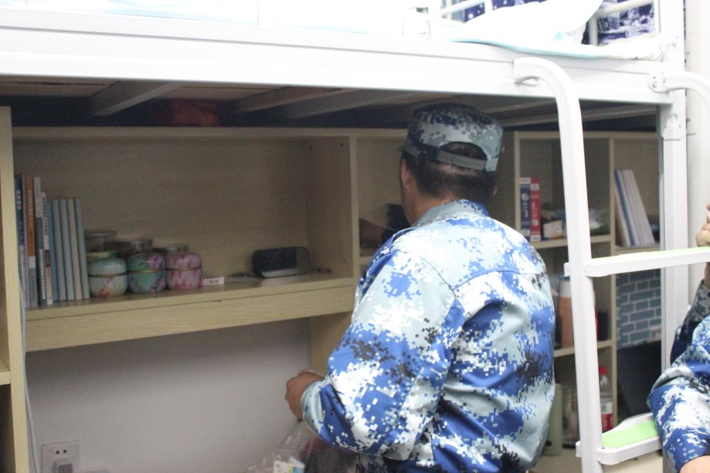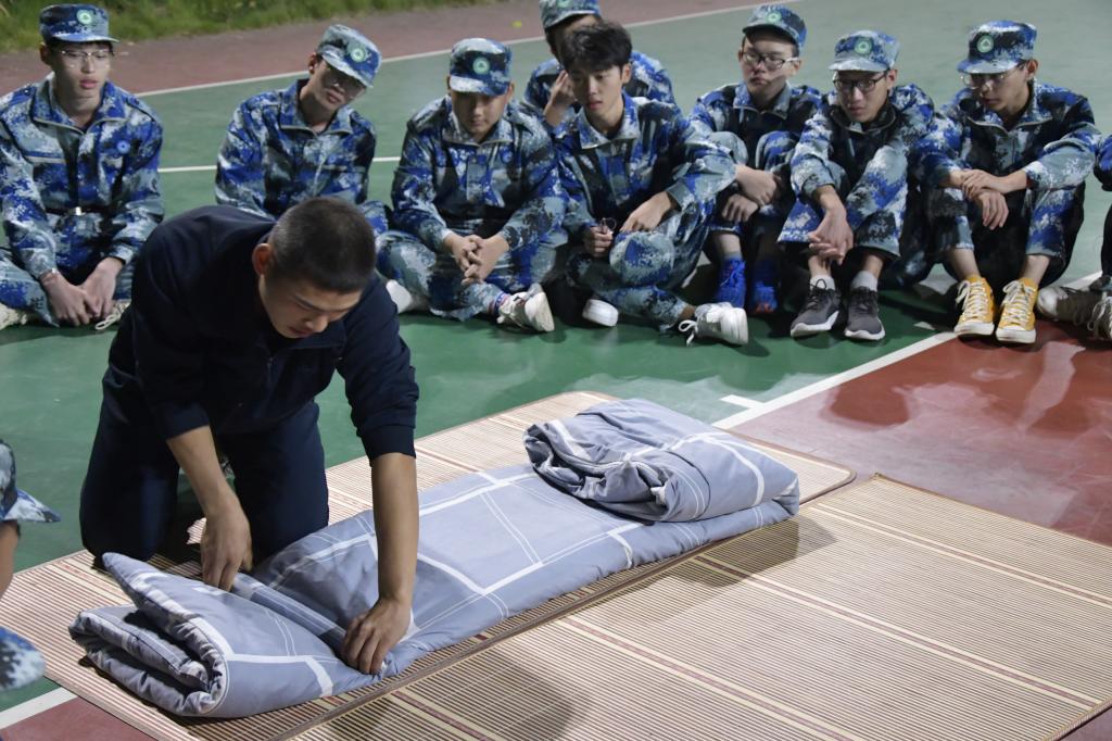 内务整理是新生军训的重要内容之一,目的是使新生养成良好的生活习惯,并持之以恒地坚持下去。教官们在操场、在宿舍按照军训标准,对同学们在宿舍物品摆放、被褥叠放、地面清扫提出了严格要求以及相关注意事项。随后,教官们为同学们演示了叠好军被的步骤,一边示范一边讲解要领。一床蓬松的棉被就在简单的“叠、压、捋”几个动作之下,变成了四四方方的“豆腐块”。叠好之后同学们再进行观摩学习,尝试自己进行整理被子。