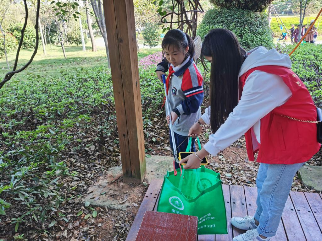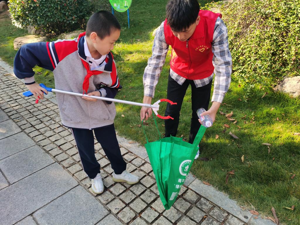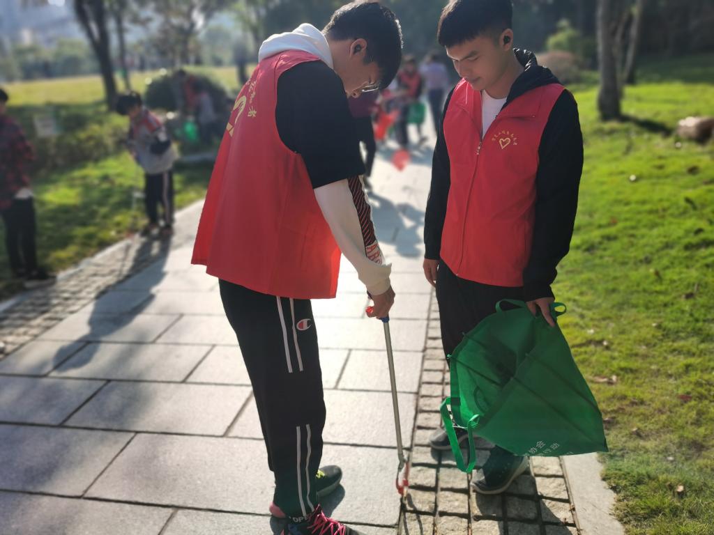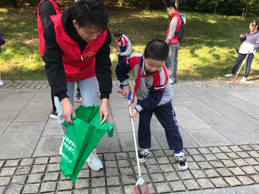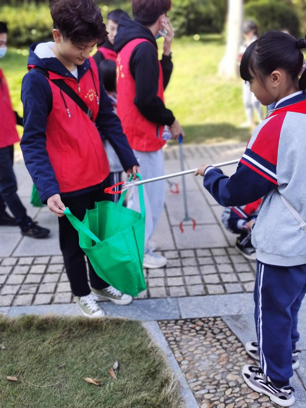 在本次的低碳环保捡拾活动中,我系志愿者和师范附小“绿苗假日行动队”的少先队员手牵手,两两配合,默契十足。在公园里随处可见大手牵小手,共同进行环保行动的暖心画面。