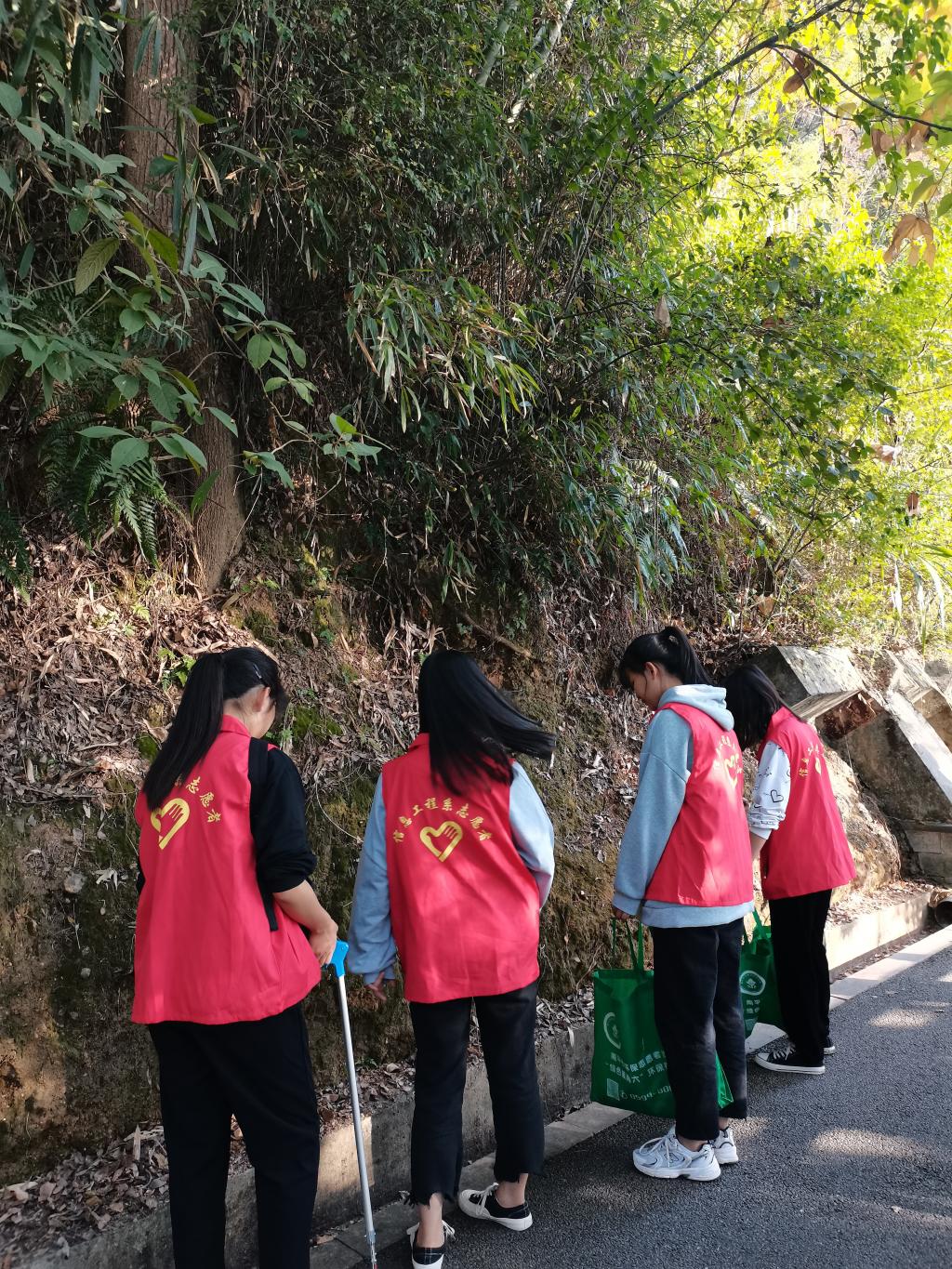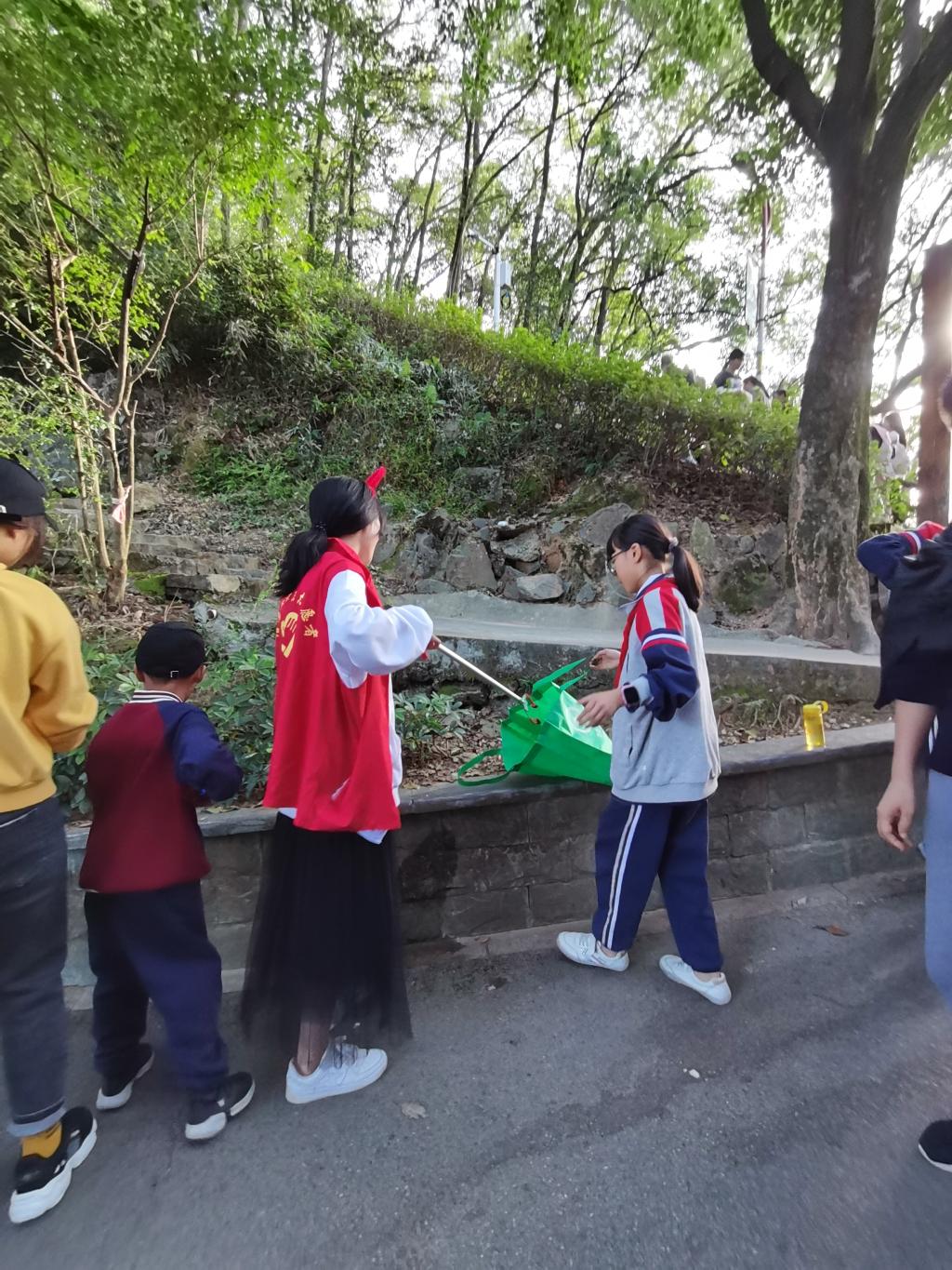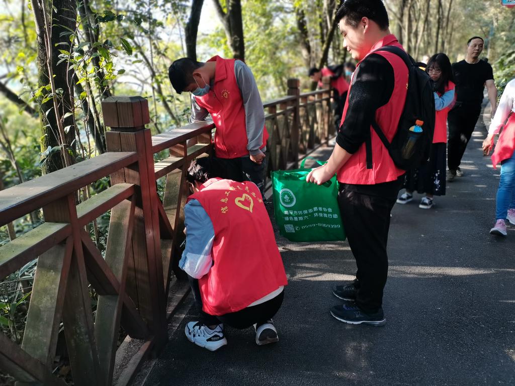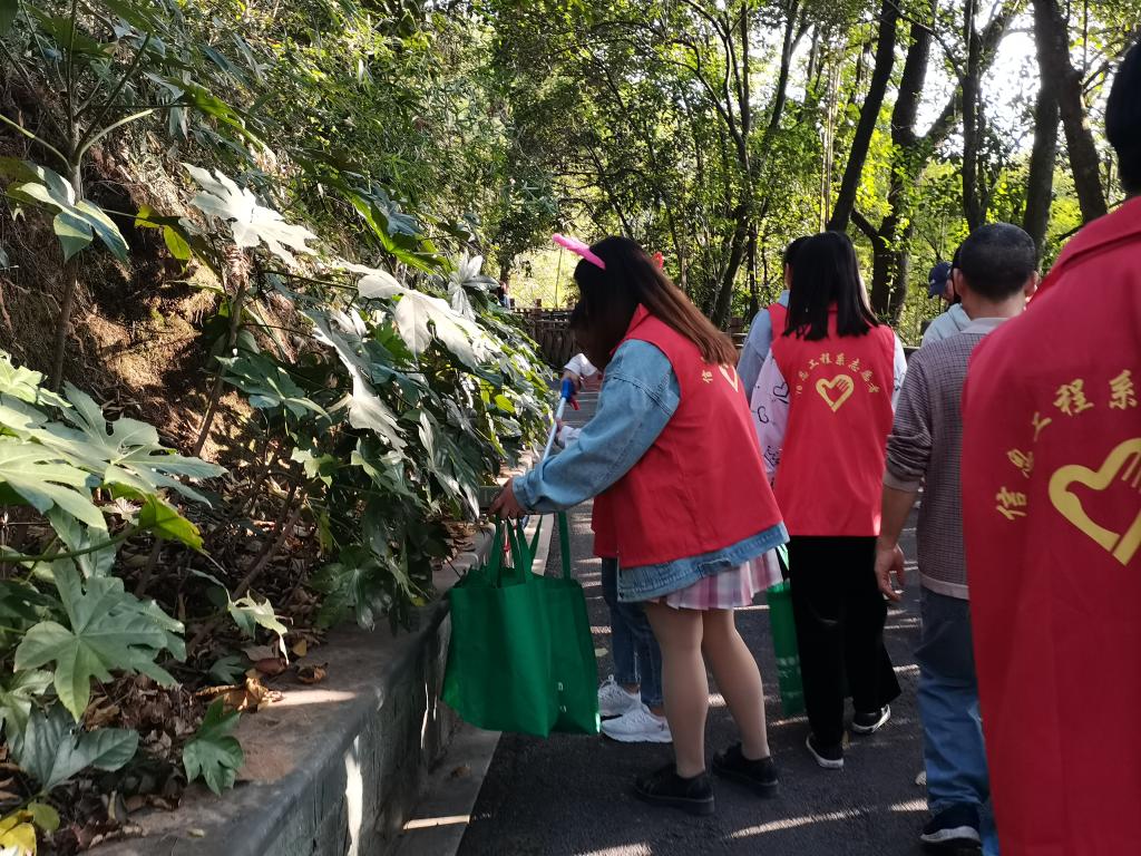 志愿者们分成了若干个清洁小组,对九峰山的垃圾进行“大扫荡”,志愿者们互相配合,拾起掉落在角落的烟头,废弃纸张等废弃杂物,保证走过的路不留下垃圾。低头忙碌的志愿者们用自己的行动充分参与劳动实践,用勤劳的双手创造美好人生。