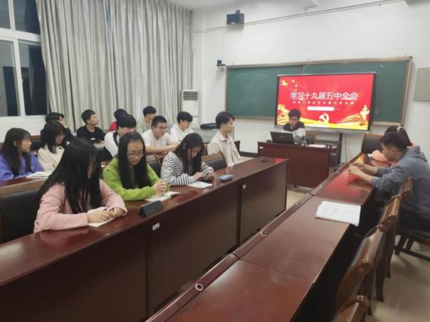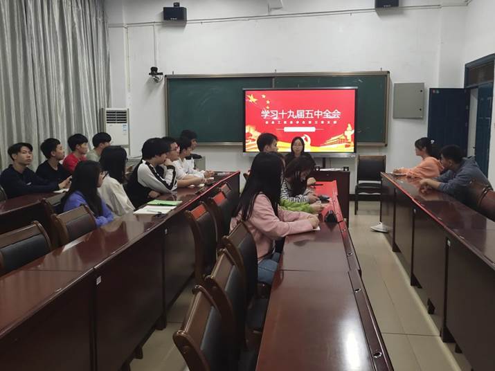 会议伊始,预备党员沈锡妹、任晓强、张达法分别为支部全体师生做线上线下微党课讲解,从党的十九届五中全会概况、具体内容、解析全会公报关键词等方面解读党的十九届五中全会,号召全体学生党员与入党积极分子立足于学校,把握学习机会,掌握本领,以党的十九届五中全会精神为指引,把个人的理想与奋斗融入到实现民族复兴伟大梦想使命之中,实现自身的人生价值与社会价值。随后,学生党员与入党积极分子热议党的十九届五中全会,林宴武、何汝洁、苏信澎等分别谈了自己对党的十九届五中全会的学习感悟。教师党员丁玲老师等结合自身谈到“十四五”规划,要求大家点燃奋斗激情,激发实干斗志,明确人生目标,找准奋斗着力点,学好本领,为社会做贡献。