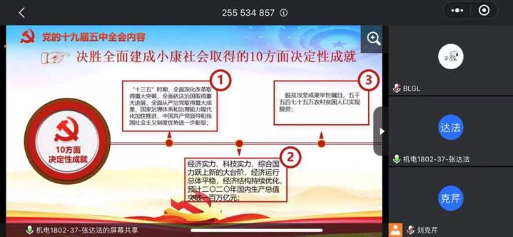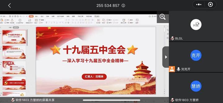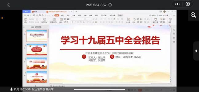 为深入学习贯彻党的十九届五中全会精神,保证党员顶岗实习期间培养教育不间断,11月26日,信息工程系学生第三党支部以线上线下相结合的方式,召开“学习宣传贯彻党的十九届五中全会精神”会议。此次会议由学生第三党支部书记刘克芹老师主持,第三党支部全体教师党员和学生党员、入党积极分子参加会议。