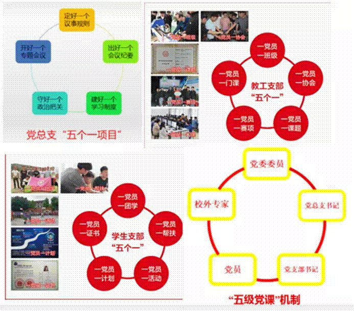 在党支部层面。实施教工支部“五个一工程”(一党员一班级、一党员一协会、一党员一课题、一党员一赛项、一党员一门课)和学生支部“五个一工程”(一党员一团学、一党员一帮扶、一党员一活动、一党员一计划、一党员一证书),有效发挥党支部强化党员教育管理、做好思想政治工作、服务广大师生员工的作用。