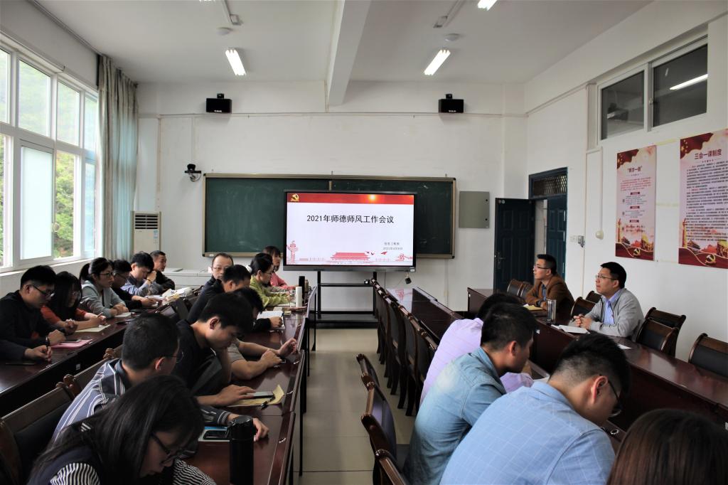 为了进一步加强系部师德师风建设,规范教师教育教学行为,培养高素质教师队伍,2021年4月6日下午,我系在实训三408会议室召开师德师风工作会议,会议由系党总支副书记罗志斌(主持工作)主持,全系教职工参加了会议。