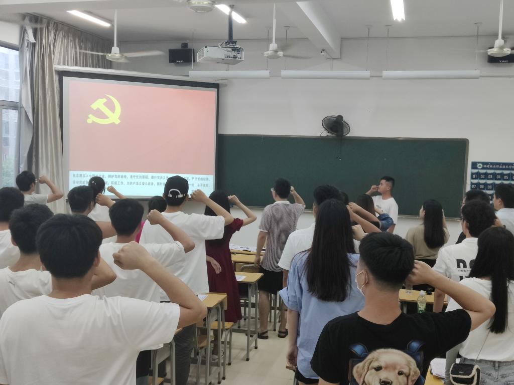 主题党课之后,全体毕业生党员进行了重温入党誓词活动。在学生第二党支部书记陈邦凯同志带领下,全体党员高举右手,面对鲜红党旗,再次庄严宣誓:“我志愿加入中国共产党……随时准备为党和人民牺牲一切,永不叛党。”铿锵恢宏的誓词震撼着在场的每一位党员,激荡着他们对党的无限忠诚,为即将踏上征程的全体毕业生党员注入了强大精神动力。