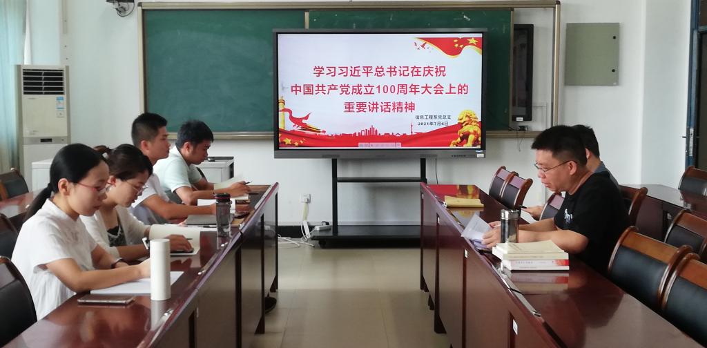 百年征程谱华章,赓续奋斗正当时。7月6日上午9:00,信息工程系在实训三党员活动室召开党总支理论学习中心组学习会,学习习近平总书记在庆祝中国共产党成立100周年大会上的重要讲话精神。学习会由系党总支副书记(主持)罗志斌主持,系党总支委员、党支部书记参加会议。
