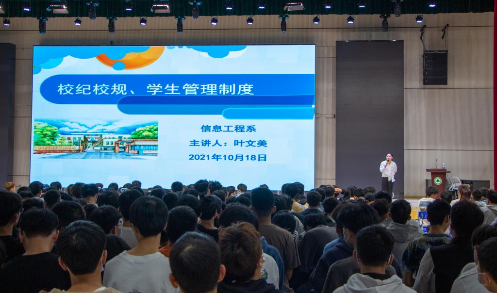为增强2021级新生遵守校纪校规的意识,帮助新生养成良好生活习惯, 10月18日晚八点,信息工程系于体育馆开展新生入学教育之高等学校学生行为准则、校纪校规和学生管理制度讲座,本次讲座由信息工程系学生科科长叶文美老师主讲,信息工程系2021级全体新生参与听讲。