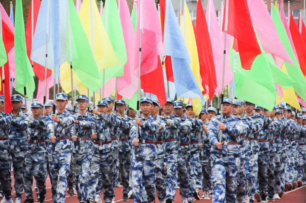 彩旗队正步走过,彩旗列列迎风展,青春洋溢、激情四射。