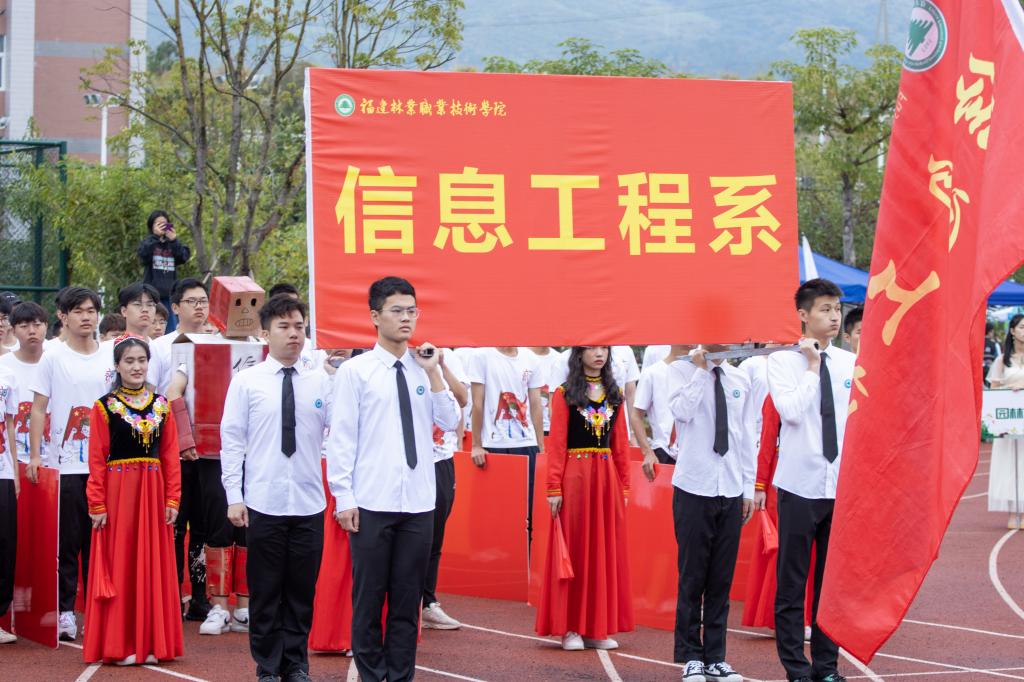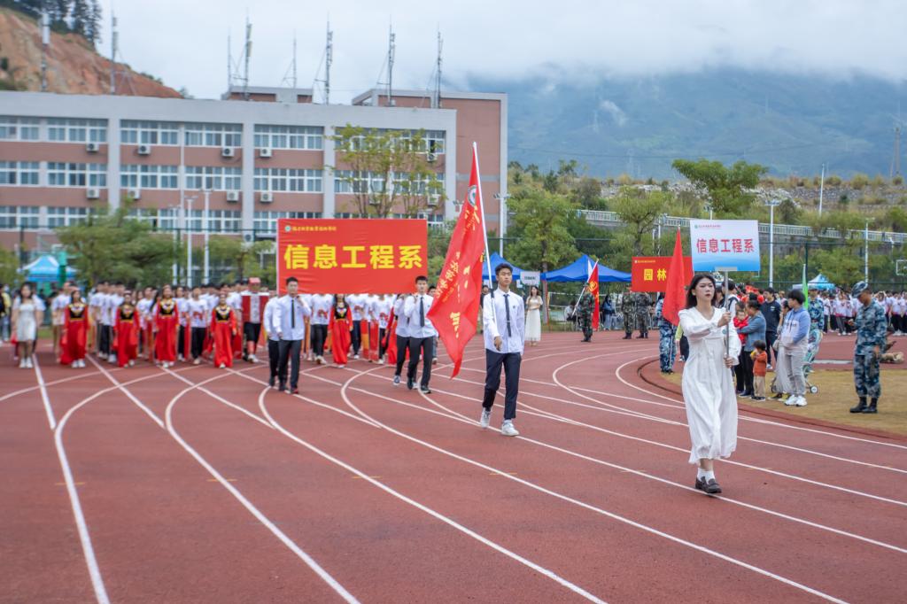 随后,各系入场式迈着整齐的步伐依次步入会场,用响亮的口号和婀娜飘逸的舞姿以及各种文化的演绎,为我们带来了精彩绝伦的表演。其中,信息工程系入场方阵以系部专业特色情景剧开篇,结合少数民族特色舞蹈,用整齐划一的动作摆出“1953、2021、校徽、国旗、强国有我”等独具创意的队列变化,他们用行动展现出信工系学子们青春风采、高昂斗志,充分凸显了林院学子拼搏奋进的精神风貌!他们英姿勃发,他们热情洋溢的口号和自信坚定的风采,获得了主席台热烈的掌声。