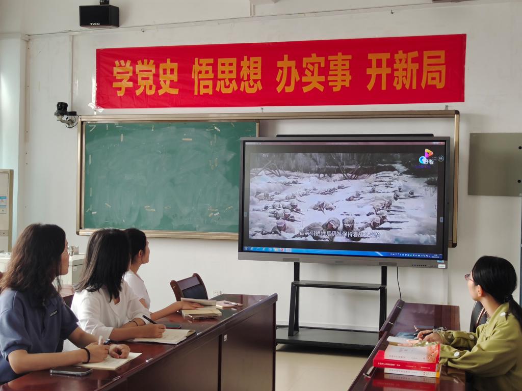 接着,通过观看近期热映的电影《长津湖》片段,该片以抗美援朝战争中的长津湖战役为背景,讲述了一段波澜壮阔的历史,红色电影展现红色精神,支部教师共同学习伟大的抗美援朝精神。
