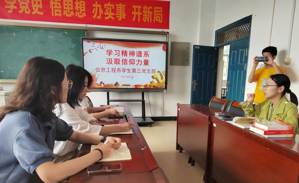为深入学习贯彻习近平总书记“七一”重要讲话精神,弘扬伟大建党精神、深入宣传中国共产党人精神谱系,信息工程系学生第三党支部于10月30日上午在实训三408会议室展开学习交流会。会议由党支部书记刘克芹老师主持,支部教师党员参加。