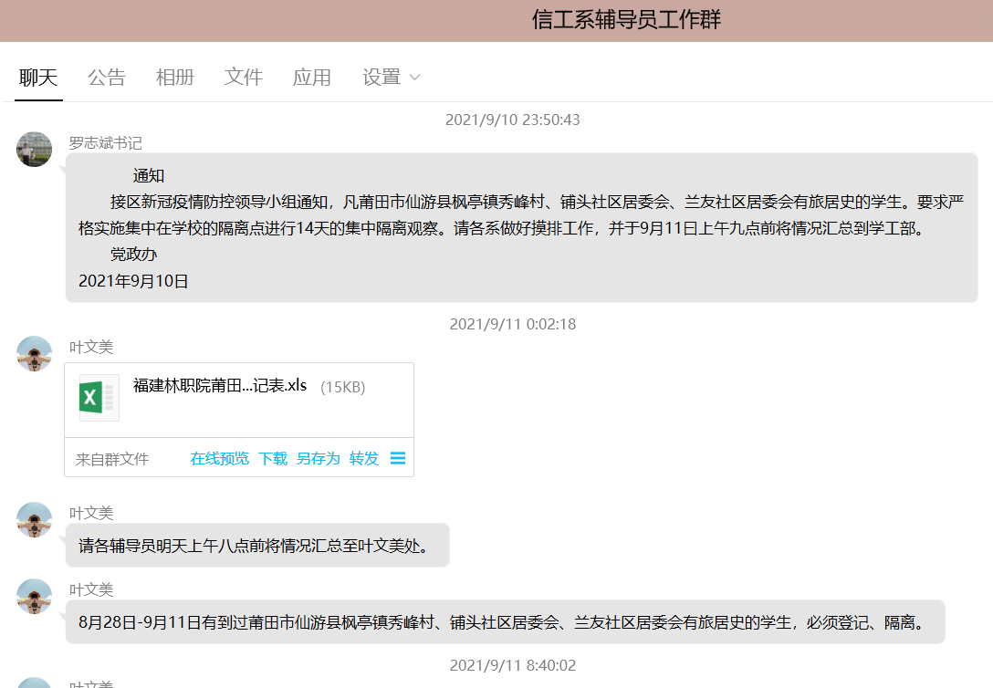 干部带头,率先垂范。疫情期间,信息工程系党政领导班子冲锋在前,发挥好带头引领作用,站在学校疫情防控第一线。带领学生工作团队,开展了大量流调、联系、教育引导工作。中秋假期系领导加强值班值守,靠前指挥,抓好应急处突工作,将莆田仙游籍因隔离后抑郁症复发的学生全程陪护送回家乡。系领导用心用情守护学生生命安全为学校疫情防控顺利实施打下坚实基础。