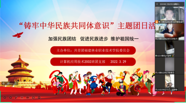 为了引导学生准确把握爱国主义、集体主义和中国特色社会主义的深刻内涵,增强中华民族共同体意识的思想自觉,加强青年学子的中华民族共同体的意识,在3月25日至4月3日,我系组织各班级团支部开展了“铸牢中华民族共同体意识”线上主题团日活动。