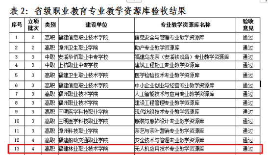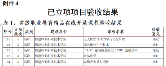 根据《福建省教育厅关于开展2021年省级职业教育信息化项目验收与2022年信息化项目申报工作的通知》(闽教职成〔2021〕48号),经院校申请、专家评审、网络公示,福建林业职业技术学院信息工程系取得佳绩,其中包含:专业教学资源库验收通过1个(《无人机应用技术专业教学资源库》),精品在线开放课程验收通过1门(《无人机空气动力学与飞行原理》),省级精品在线开放课程立项2门(《MySQL数据库技术》和《HTML5与CSS3 开发技术》)。