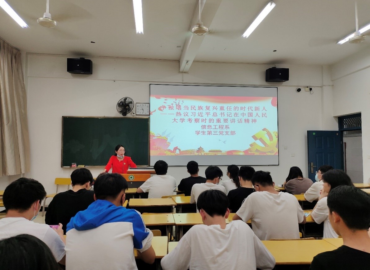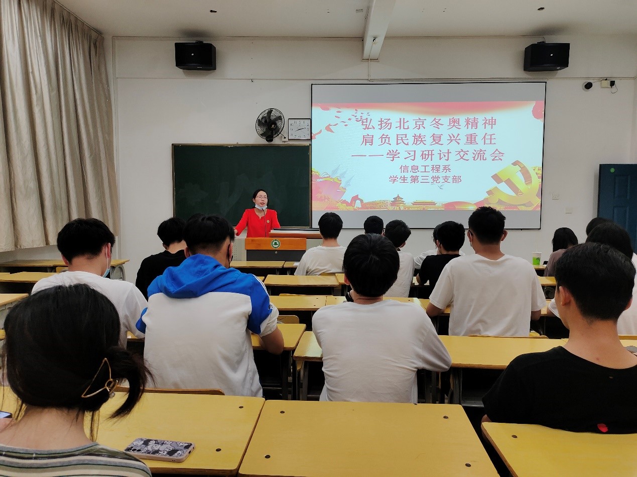 伟大的事业孕育伟大的精神,伟大的精神推进伟大的事业。为更好地弘扬北京冬奥精神,深刻领会“两个确立”的深远意义,学习习近平总书记在中国人民大学考察时的重要讲话精神,信息工程系学生第三党支部于4月28日晚在实训四407教室召开学习研讨交流会。本次学习会由信息工程系第三党支部书记刘克芹老师主持,支部学生党员、入党积极分子参加这次学习会。