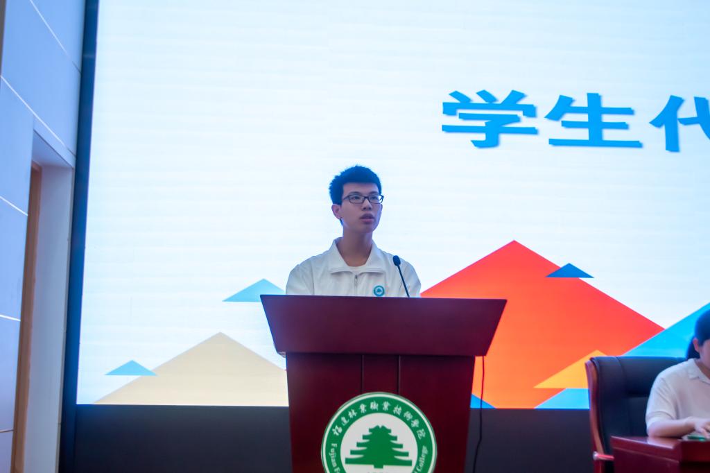 会议第三项议程是学生代表邱俊翔同学发言,他衷心感谢本次比赛学校领导的关心和重视,感谢系部为同学们提供了一个良好的学习交流平台。他表示作为一名新时代职业院校的一名学子,要勤学苦练、深入钻研,勇于创新、敢为人先,努力学好专业知识,不断提高技术技能水平,走技能成才、技能报国之路,成为有理想、敢担当、能吃苦、肯奋斗的新时代好青年。