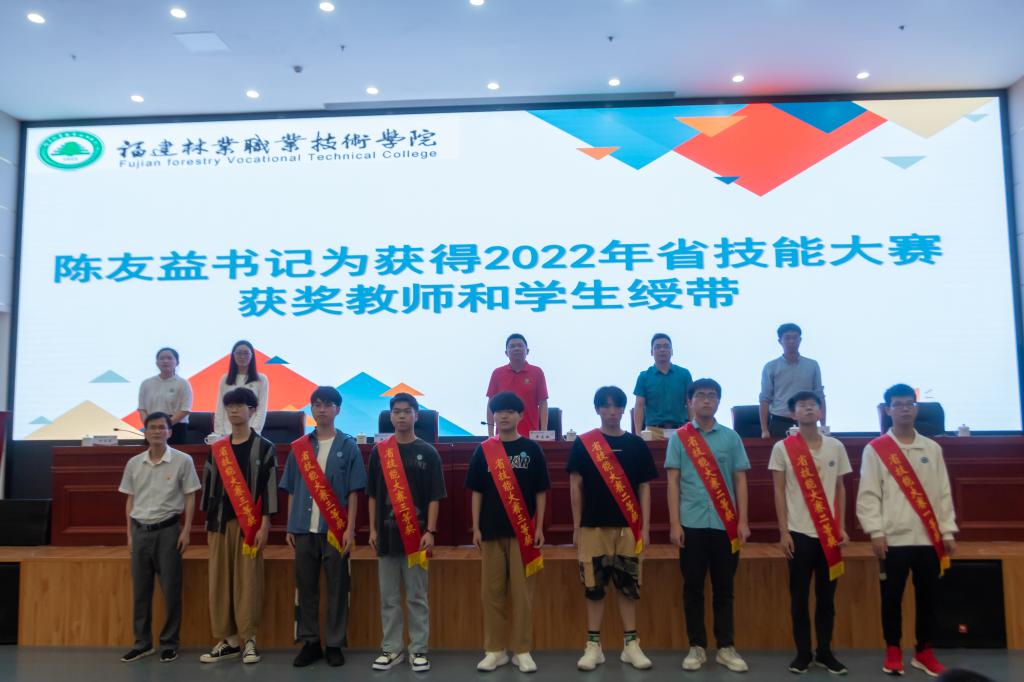 随后,学院团委书记陈友益为2022年省技能大赛获奖优秀指导老师、获奖学生绶带。