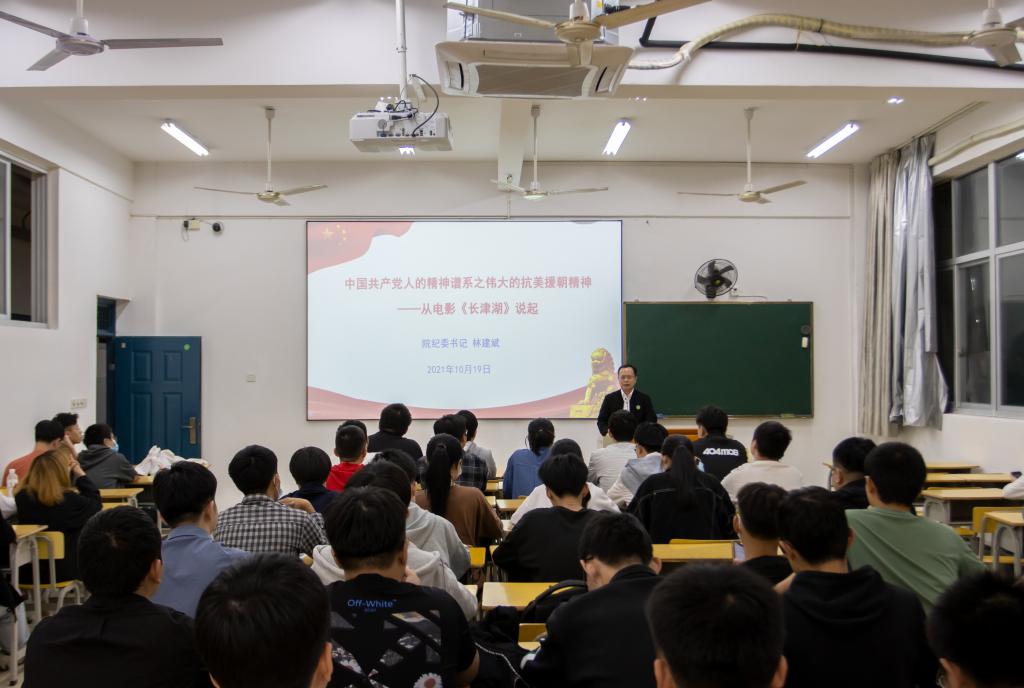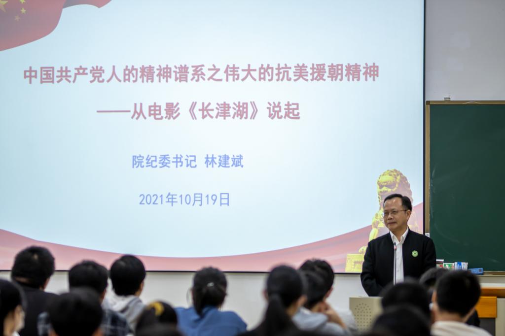 “伟大抗美援朝精神是中国共产党人精神谱系的重要组成部分,是我们弥足珍贵的精神财富”,为了让同学们更好的了解历史,林建斌书记给同学们播放视频,打造“沉浸式”党史学习教育模式,教育引导广大青年学生厚植爱党、爱国、爱社会主义的情感。