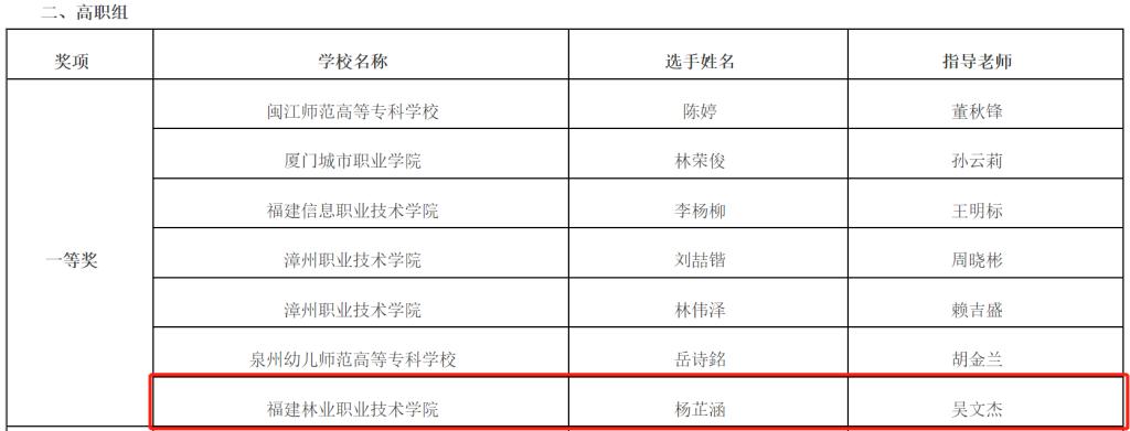 据悉,本届大赛自启动以来,各高校便广泛开展了形式多样的宣传活动,积极动员学生参与,在全省85所高校报送的159件作品中,共选出70件优秀作品进入决赛。根据《福建省教育厅关于举办第十五届福建省大学生职业规划大赛的通知》(闽教学〔2022〕31号)要求,经过高校推荐、省赛网评和线上决赛,最终决出本科组一等奖7名、二等奖10名、三等奖12名、优秀奖5名;专科组一等奖7名、二等奖10名、三等奖12名、优秀奖5名;优秀指导教师奖14名,优秀组织奖14个。杨芷涵同学在吴文杰老师的精心指导下,凭借着科学的职业规划设计和清晰的职业认知在比赛中脱颖而出,荣获第十五届福建省大学生职业规划大赛一等奖。