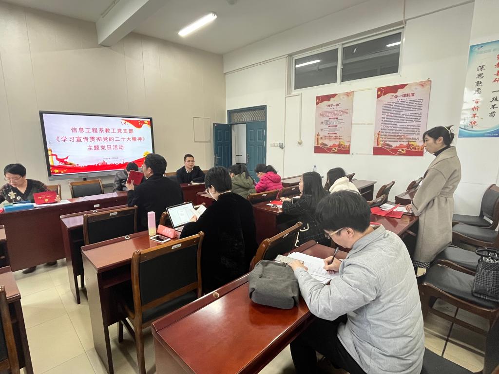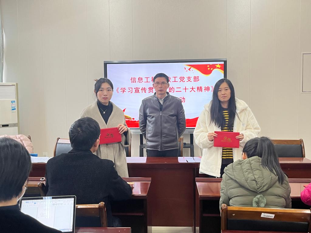 为持续推动学习宣传贯彻党的二十大精神入脑入心,引导教师党员积极发挥先锋模范作用,2022年12月6日,信息工程系教工党支部在实训三党员活动室组织开展学习宣传贯彻党的二十大精神主题党日活动,为陈小芳、周亭亭两位同志过政治生日。活动由教工党支部书记张晓璐主持,副院长谢金生及教工党支部全体党员参加了活动。