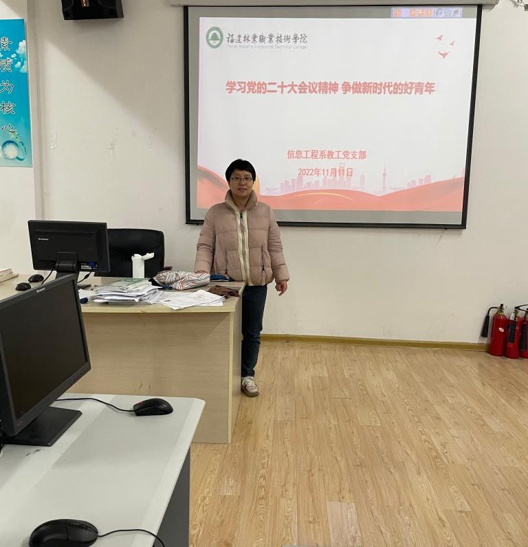 为深入学习贯彻党的二十大精神,引导青年学子筑牢精神之基,厚植爱国情怀,矢志不渝跟党走,2022年11月11日15:00,信息工程系教工党支部书记张晓璐老师为系部学生入党积极分子宣讲党的二十大精神。