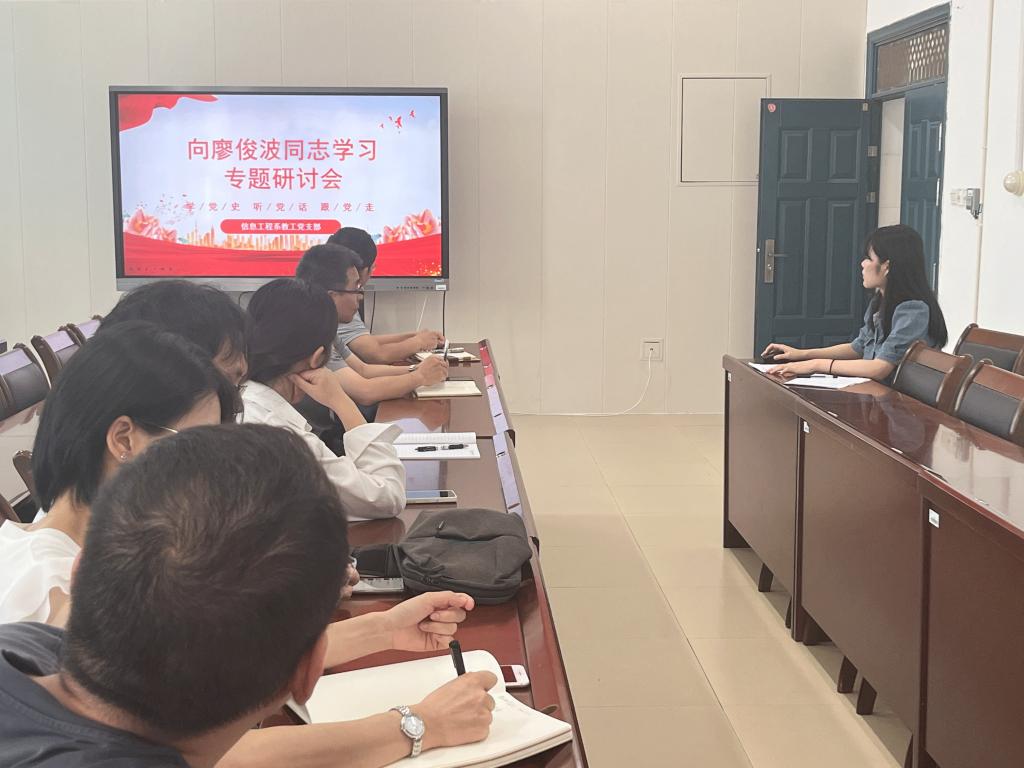 为深入开展学习贯彻习近平新时代中国特色社会主义思想主题教育,贯彻落实中共南平市委印发《关于实施“深学争优、敢为争先、实干争效”行动的工作方案》,深入学习廖俊波同志等先进典型,大力发扬斗争精神、专业精神、实干精神、团结精神,激励广大党员对标先进、担当作为,6月21日上午信息工程系教工党支部在实训三408会议室开展学习贯彻习近平新时代中国特色社会主义思想主题教育学习会暨学习廖俊波同志优秀品质专题研讨会。支部全体党员参加,学习会由教工党支部宣传委员江晨琳主持。