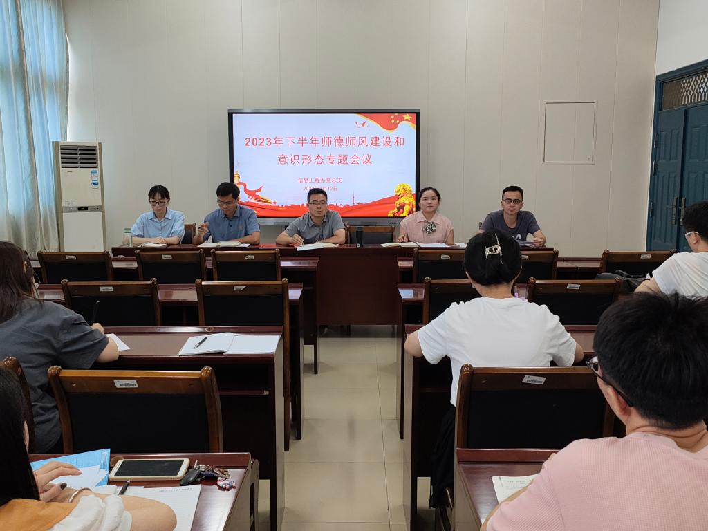 为进一步全面贯彻党的教育方针,加强我系新学期师德师风建设和意识形态工作,9月12日下午,信息工程系党总支于信工楼408会议室召开2023年下半年师德师风建设和意识形态专题会议,系部全体教职工参加了会议,会议由系党总支副书记(主持工作)叶文美主持。