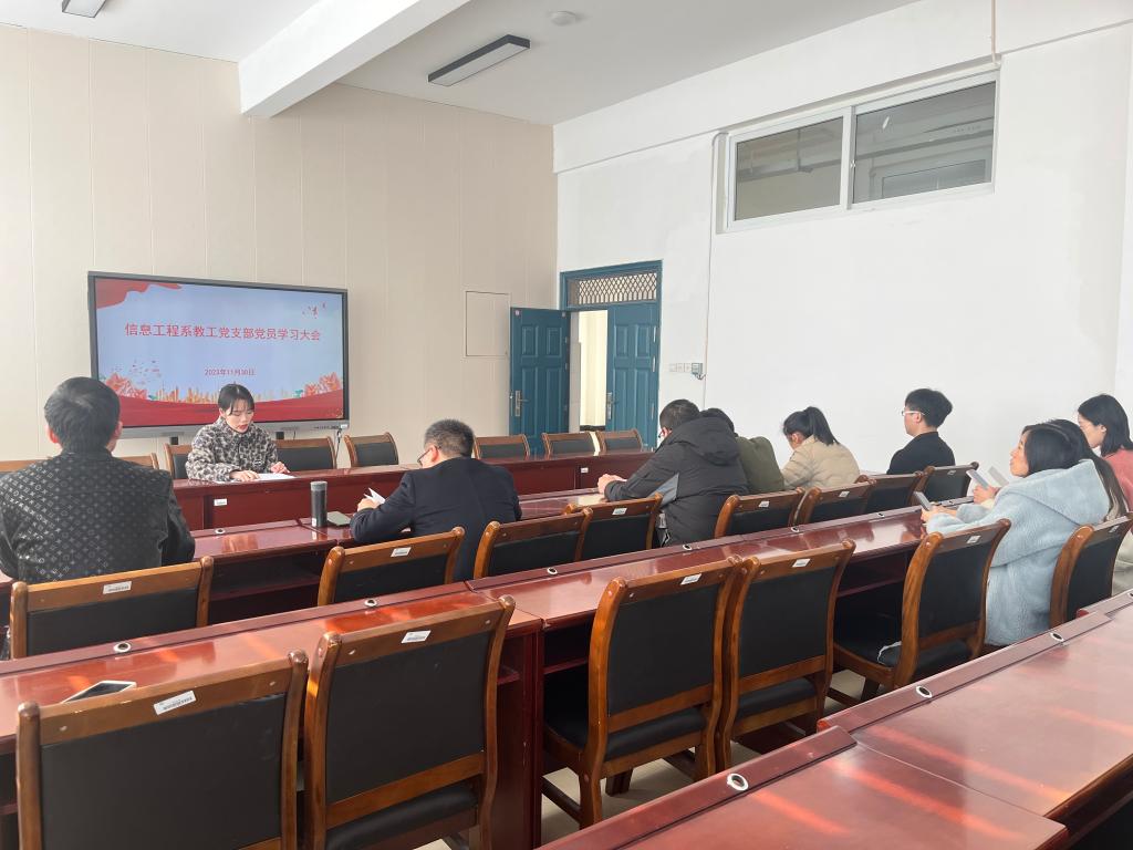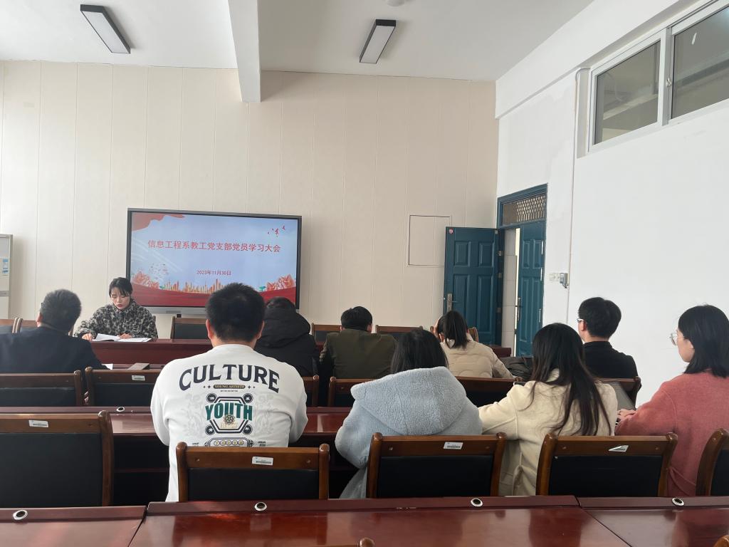 11月30日下午,信息工程系教工党支部在实训三408会议室召开了党员学习大会,会议由支部宣传委员江晨琳老师主持。会议主要围绕《中华人民共和国爱国主义教育法》、教育部等四部门《职业学校兼职教师管理办法》以及习近平总书记在中共中央政治局第九次集体学习时的重要讲话展开。