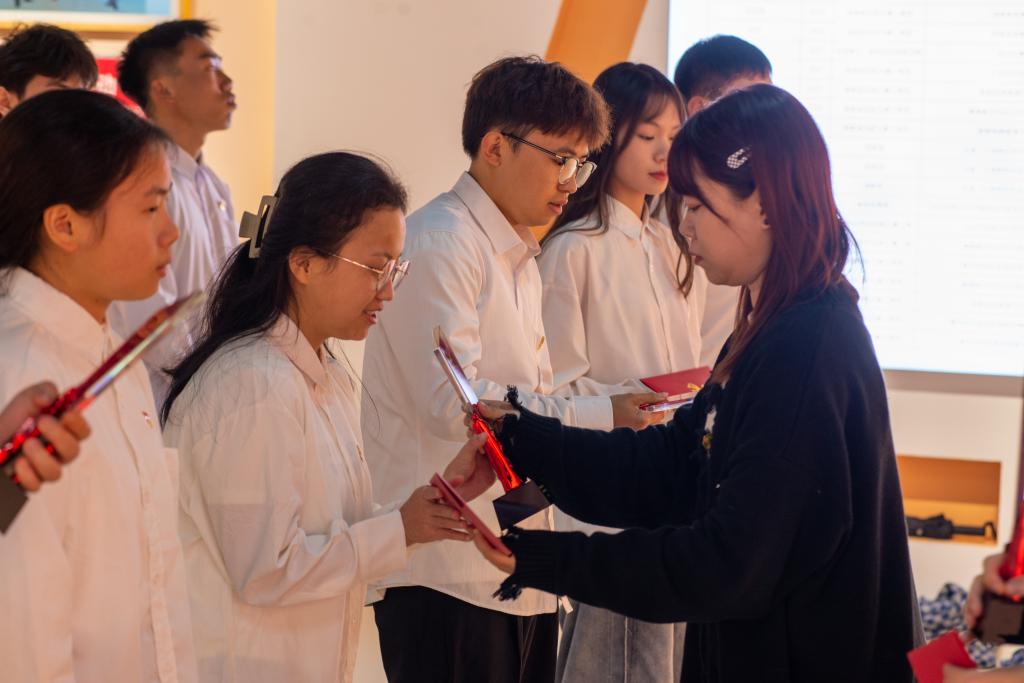 宣誓结束后,支部书记郑燕丽老师对52期预备党员送出淳淳寄语,“希望在党和国家需要的时候,各位党员同志们可以铭记自己的党员身份和入党誓词,无论是在个人发展和社会贡献中,都无愧于党员身份”。随后,郑燕丽、陈雅佳老师为第一、第二党支部的学生党员送出政治生日纪念奖杯和贺卡。学生党员深切感受到党支部对每位学生党员的关心和关怀,他们表示将在接下来的生活中坚守崇高理想,铭记入党誓词。