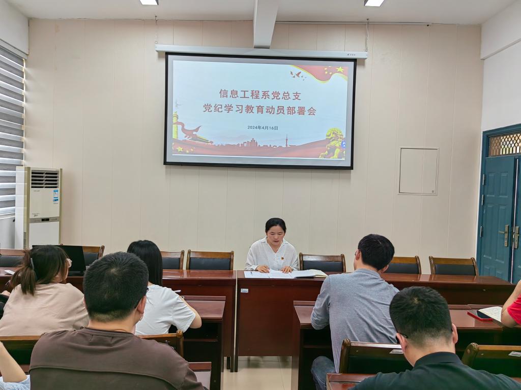 4月16日下午,信息工程系党总支召开党纪学习教育动员部署会,传达学习习近平总书记关于党纪学习教育的重要讲话和重要指示精神,学习贯彻落实中央党的建设工作领导小组会议和《中共中央办公厅关于在全党开展党纪学习教育的通知》精神以及省委常委会会议暨党的建设工作领导小组会议精神和院党委扩大会议暨党的建设和全面从严治党工作领导小组会议精神,专题部署开展党纪学习教育。系党总支副书记(主持工作)叶文美主持会议,系部全体师生党员参加会议。