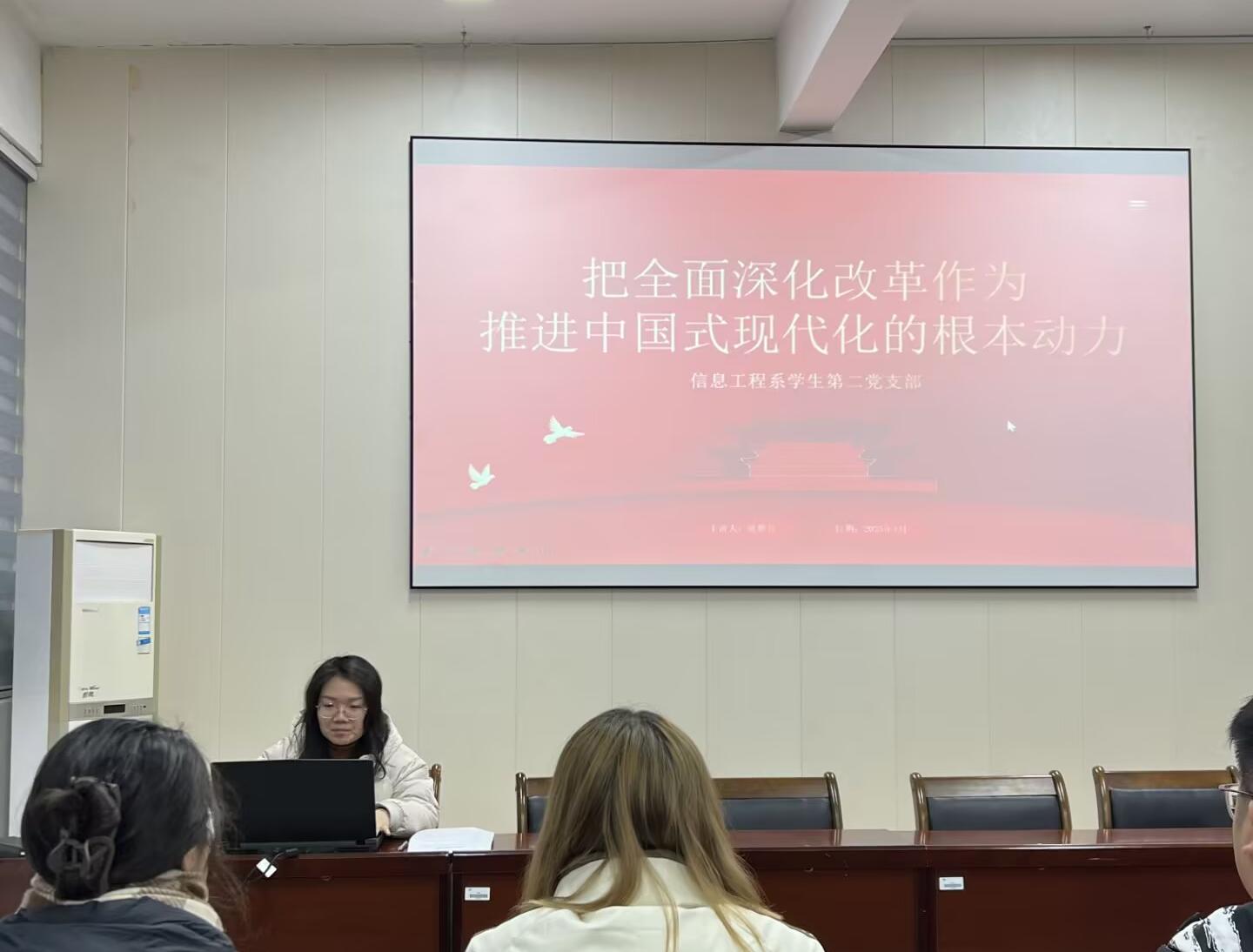 2025年1月2日,信息工程系学生第二党支部在信工楼408会议室开展了一场学习贯彻党的二十届三中全会精神的专题党课,党课主题为“把全面深化改革作为推进中国式现代化的根本动力”。此次党课旨在深入学习贯彻全会精神,引领支部党员精准理解与把握其核心要义,激励党员勇担时代使命,积极投身于中国式现代化建设之中。