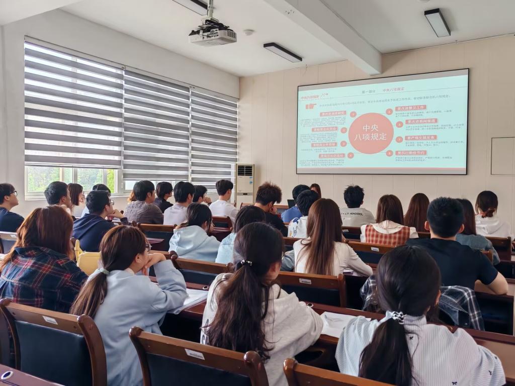 以习近平同志为核心的党中央从制定和落实中央八项规定开局破题,坚持自上而下、以上率下,解决了新形势下作风建设抓什么、怎么抓的问题。4月8日,信息工程系学生第一党支部于信工楼408会议室开展深入贯彻中央八项规定精神学习教育专题党课。党课由支部书记郑燕丽主讲,全体师生党员及59期入党积极分子参加了本次学习。