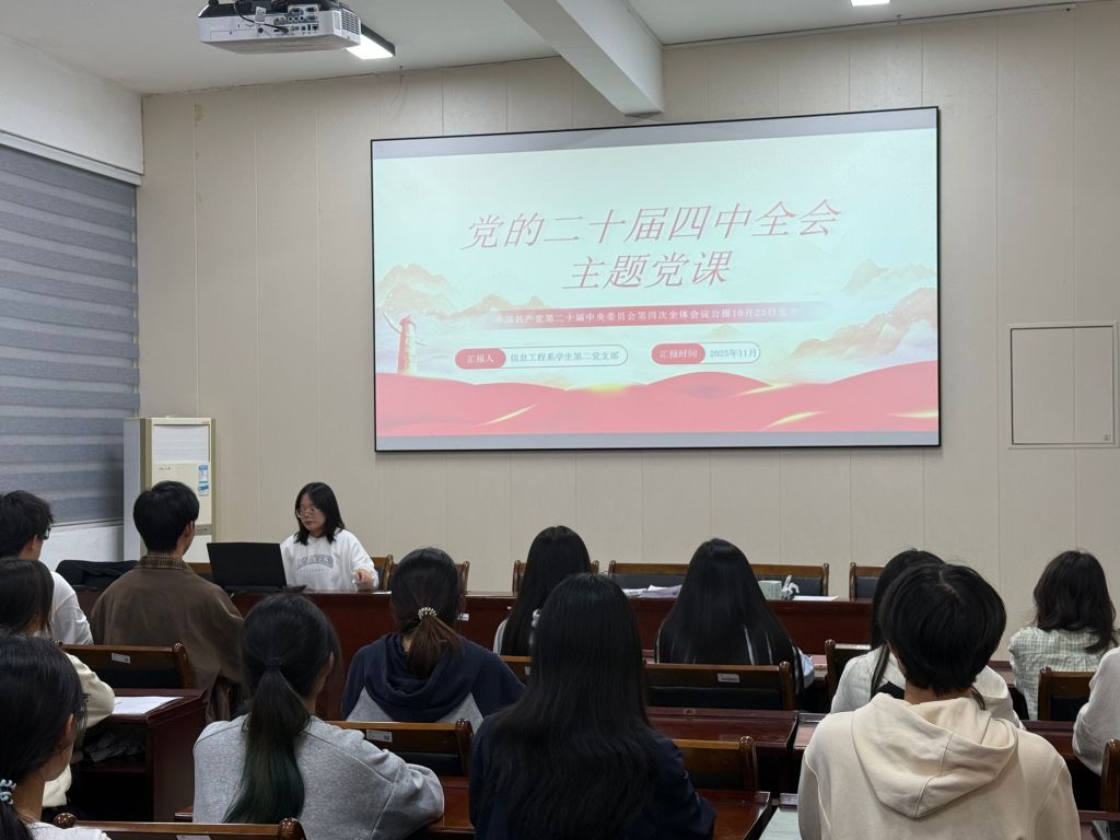 为深入学习贯彻党的二十届四中全会精神,2025年11月14日信息工程系学生第二党支部开展了主题为“党的二十届四中全会”的专题党课,本次党课由党支部书记林珍老师主讲,支部教师党员和入党积极分子参加了本次学习。