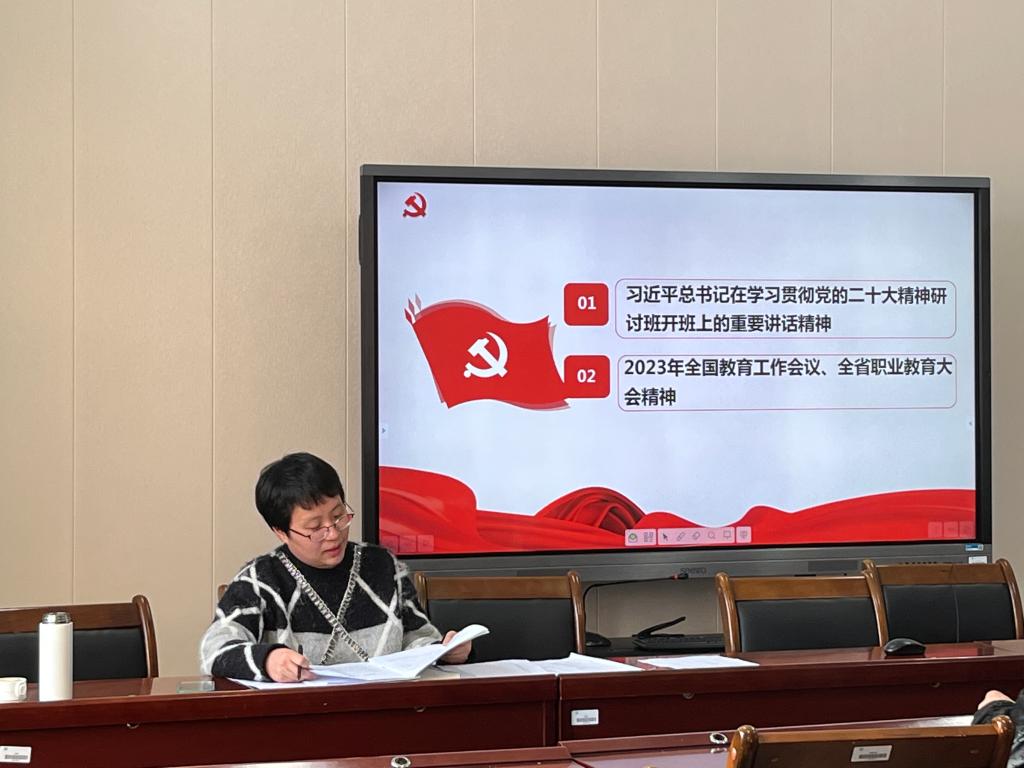 教工党支部书记张晓璐老师带领支部党员学习领会了习近平总书记在学习贯彻党的二十大精神研讨班开班式上的重要讲话精神,2023年全国教育工作会议、全省职业教育大会精神和二十届中央纪委二次全会、省纪委十一届三次全会精神等。
