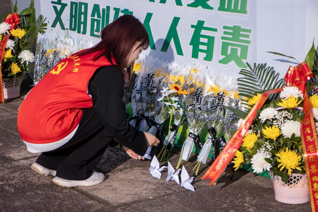 青山埋忠魂,山河念英魂。下午16时许,40余名参与祭扫的师生党员和青年志愿者怀着无比崇敬的心情到达南平市九峰山革命纪念碑,在巍然耸立的人民英雄纪念碑前举行了庄重肃立的悼念仪式。全体师生整齐排开,集体肃立,退伍军人代表苏睿、郑成梁、吴斌、吴铭义同志为革命烈士敬献花篮。在耸立的纪念碑前,全体师生着装整齐,表情庄重,脱帽默哀,表达对革命先烈的敬意与告慰。默哀后,信息工程系党总支副书记叶文美老师和团总支书记吴文杰老师分别为烈士整理挽联和宣读祭文,全体师生逐一为烈士献上师生共同制作的花束与千纸鹤,致敬英雄事迹,赓续先烈遗志,传承先烈精神。信息工程系专职组织员谢婉欣老师带领全体参加祭扫的师生党员,在人民英雄纪念碑前庄重地重温入党誓词,铮铮誓言响彻于青山之间。