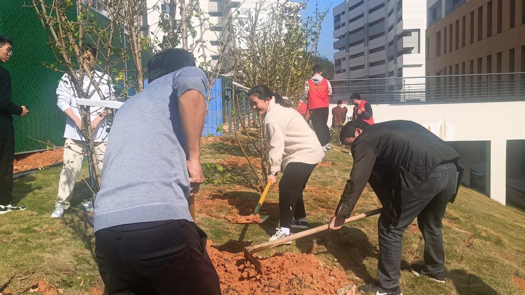 在植树活动现场,师生们密切分工、团结合作,挥锹挖土、提桶抬水、填坑埋树、灌水扶苗,不怕脏、不怕累,大家干劲十足。春风十里,不及一抹绿意,一颗颗新栽种的树苗迎风挺立,展现着蓬勃向上的生机活力。