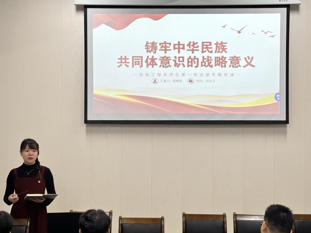 为深入学习习近平新时代中国特色社会主义思想,全面贯彻和落实习近平总书记关于加强和改进民族工作的重要论述,铸牢中华民族共同体意识,推动新时代党的民族工作高质量发展,3月24日晚,信息工程系学生第一党支部书记郑燕丽在信工楼408会议室为55期及56期入党积极分子开展“铸牢中华民族共同体意识”专题党课。