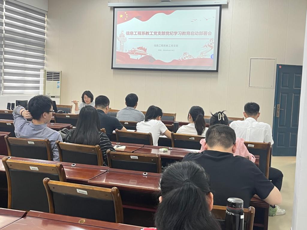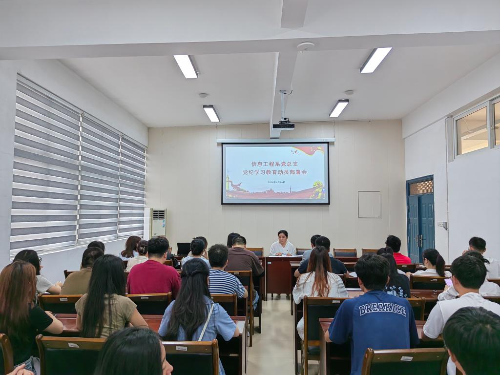4月16日下午,信息工程系党总支召开党纪学习教育动员部署会,传达学习习近平总书记关于党纪学习教育的重要讲话和重要指示精神,学习贯彻落实中央党的建设工作领导小组会议和《中共中央办公厅关于在全党开展党纪学习教育的通知》精神以及省委常委会会议暨党的建设工作领导小组会议精神和院党委扩大会议暨党的建设和全面从严治党工作领导小组会议精神,专题部署开展党纪学习教育。系党总支副书记(主持工作)叶文美主持会议,系部全体师生党员参加会议。