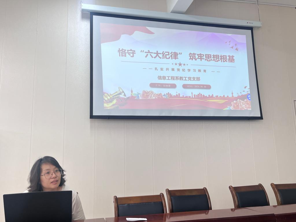 为进一步加强党风廉政建设,提高党员的思想认识和纪律意识,2024年6月6日,信息工程系教工党支部书记张晓璐老师在信工楼408会议室为支部全体教师党员和55期学生党员讲授以《恪守“六大纪律” 筑牢思想根基》为主题的党纪学习教育专题党课。