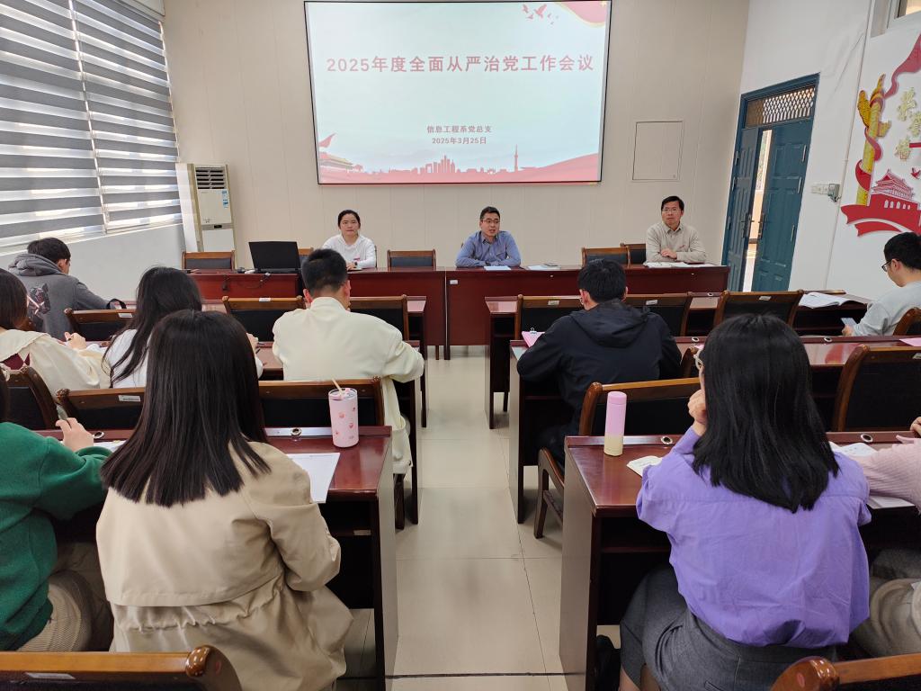 2025年3月25日下午,信息工程系党总支在信工楼408会议室召开2025年度全面从严治党工作会议,系部全体教职工参加了会议,会议由系党总支书记、主任华建祥主持。