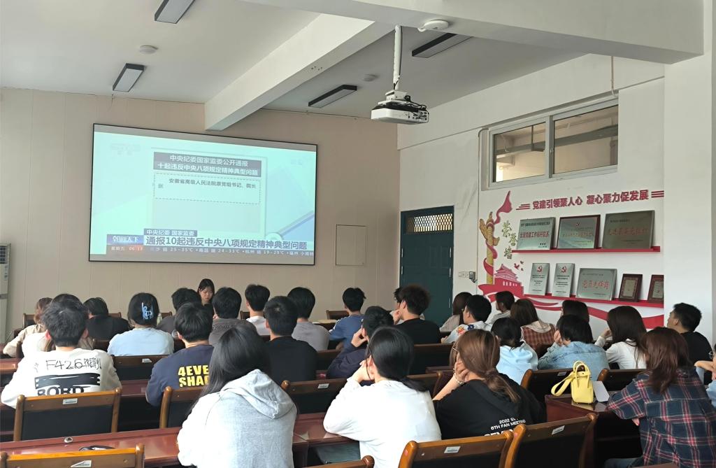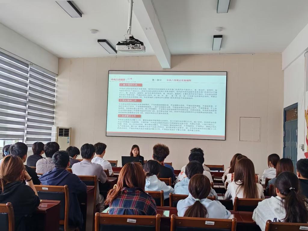 以习近平同志为核心的党中央从制定和落实中央八项规定开局破题,坚持自上而下、以上率下,解决了新形势下作风建设抓什么、怎么抓的问题。4月8日,信息工程系学生第一党支部于信工楼408会议室开展深入贯彻中央八项规定精神学习教育专题党课。党课由支部书记郑燕丽主讲,全体师生党员及59期入党积极分子参加了本次学习。