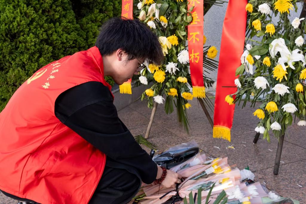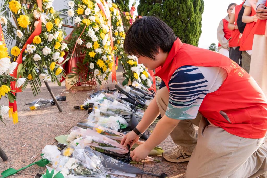 默哀仪式后,师生们有序献上鲜花和手折千纸鹤。一束束洁白的菊花寄托着对先烈的敬仰,一只只千纸鹤承载着对英魂的祝福,每只千纸鹤上都代表着青年学子对先烈的缅怀。校史馆里的每一段文字都是奋斗者的史诗,纪念碑上的每一个刻痕都是革命者的勋章。作为新时代学生党员和入党积极分子,更要从历史中汲取力量,从先烈身上传承精神,让红色基因在新时代绽放新光芒。